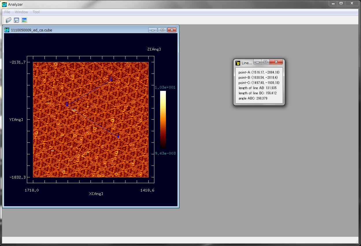 Si(111)-(7×7)DAS構造のSPM実験画像上に、三点A, B, Cを指定して、線分AB、線分BCの長さ、および∠ABCを測定する